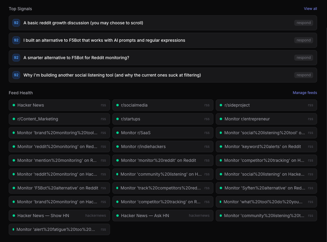 That's the part that still feels a little surreal. I set up a project, described the product, defined my ICP (SaaS founders, indie hackers, GTM teams), added the competitor list, and configured feeds for "F5Bot alternative", "brand monitoring tool", "social listening", and 25 other queries.